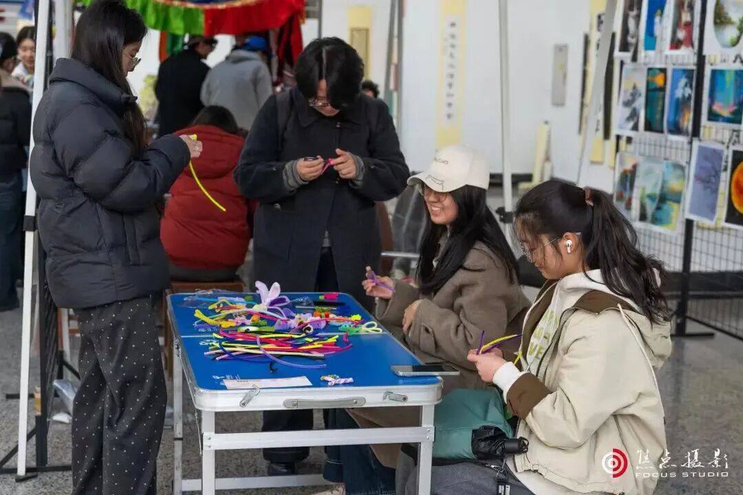 刀笔油画社的“手绘拾光”摊位前,社员们现场示范绘画技巧,指导师生勾勒线条、调配色彩,一幅幅生动的画作在指尖诞生。