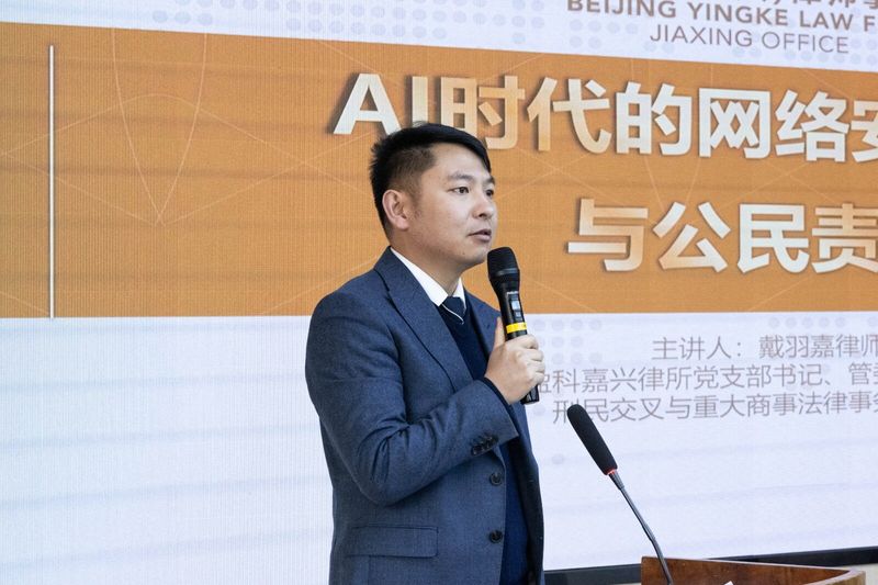 盈科(嘉兴)律师事务所戴羽嘉书记以 “AI时代的网络安全挑战与公民责任” 为主题,结合生活实例,分析了当代网络安全问题,并从法律的角度对这些安全挑战进行分析,强调了法治与每个公民担责的重要性,强调同学们应遵守网络安全,合法合规上网。